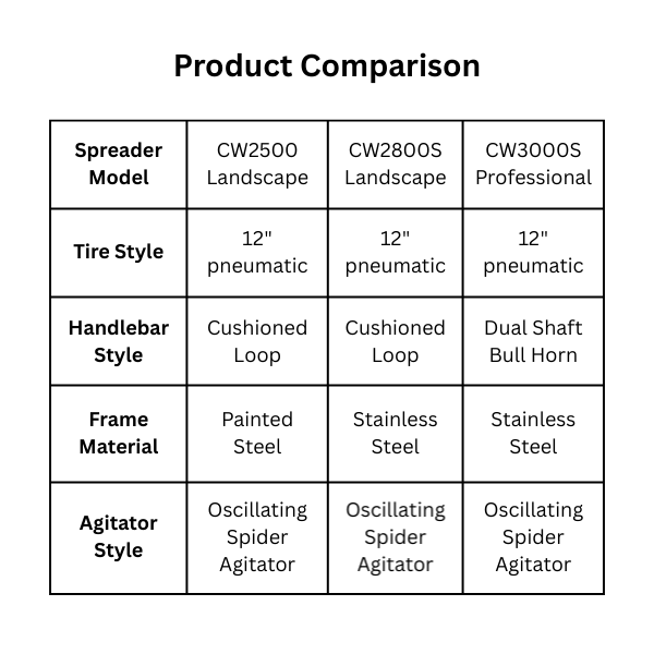 Whether you need to spread salt on your icy driveway or fertilizer on your lawn for the upcoming season, Charles Walters will have you prepared for your spreading needs for your professional landscaping operation! Carrying up to approximately 80 pounds, these sturdy spreaders feature an adjustable t-bar style lever control to change the rate of your spread with 20 settings. The knobby pneumatic tires are great for gripping onto rough, hilly, or icy terrain for easy movement. The Spreader disperses material in a 20 foot width using an 9.4 inch impellor. A steel rod is used as the linkage for the shut-off function, giving a smooth, solid, on/off to create a consistent flow of material through the hopper. This rod will not bend or bind like a cable. Spreading rates may vary depending on the characteristics of the material in the hopper. These spreaders come partially assembled, requiring only 5-10 minutes to complete.