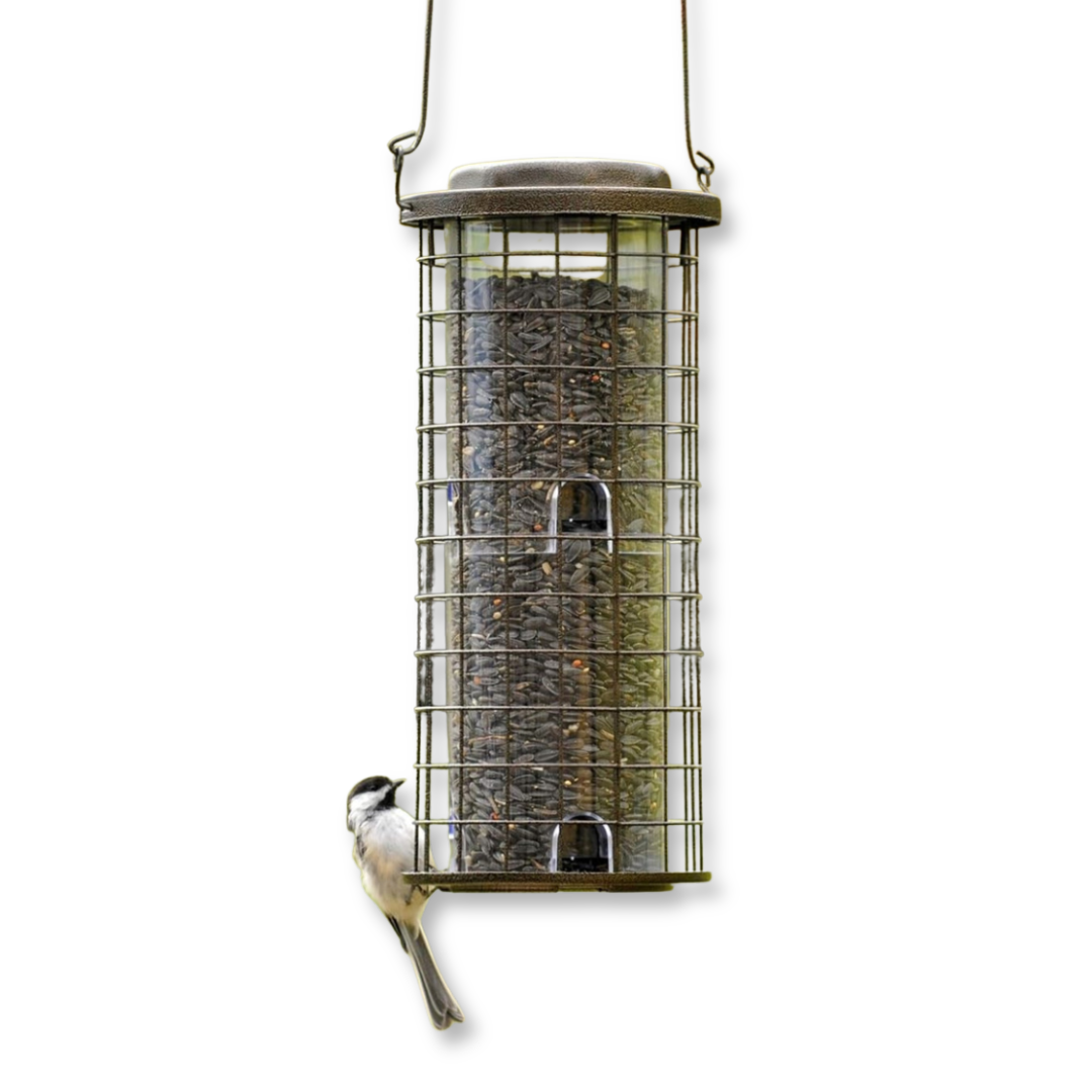 Squirrel-resistant cap keeps the lid firmly in place. Large tray and circular perch offer 360° feeding with consistent seed flow. Powder-coated for durability and ready to hang with a built-in cable.